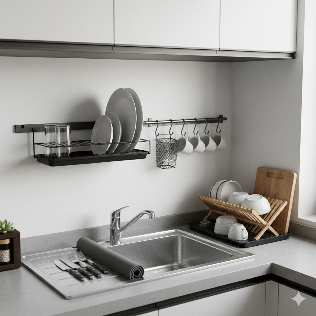 벽면에 튼튼한 스테인리스 와이어 선반이나 접이식 행거를 설치하면 바닥 공간을 전혀 차지하지 않고 식기를 말릴 수 있습니다. 저는 싱크대 양옆 벽에 드릴로 홀이 없는 부위만 골라 앵커를 박고, 가로×세로 40cm 정도 크기의 와이어 선반을 부착했습니다.